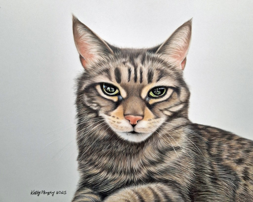 Creating a tabby cat portrait is a bit like doing the hokey pokey- you add some colour in, take some colour out, add more colour in. Layering tones and adjusting values is key to achieving that signature striped look.